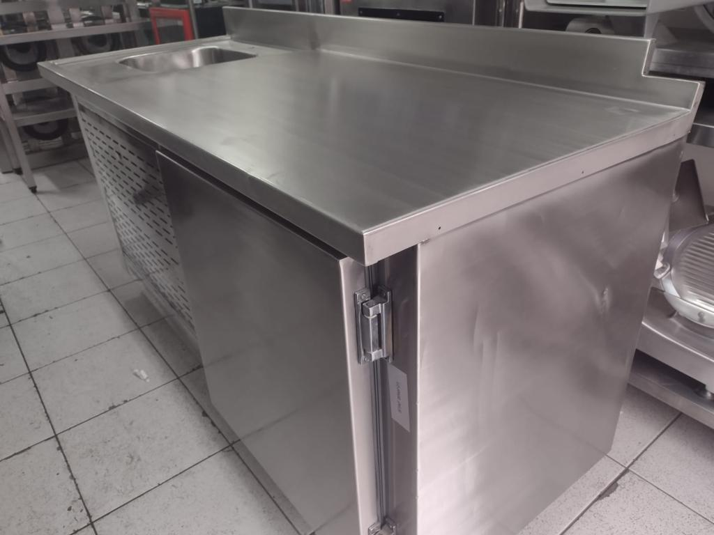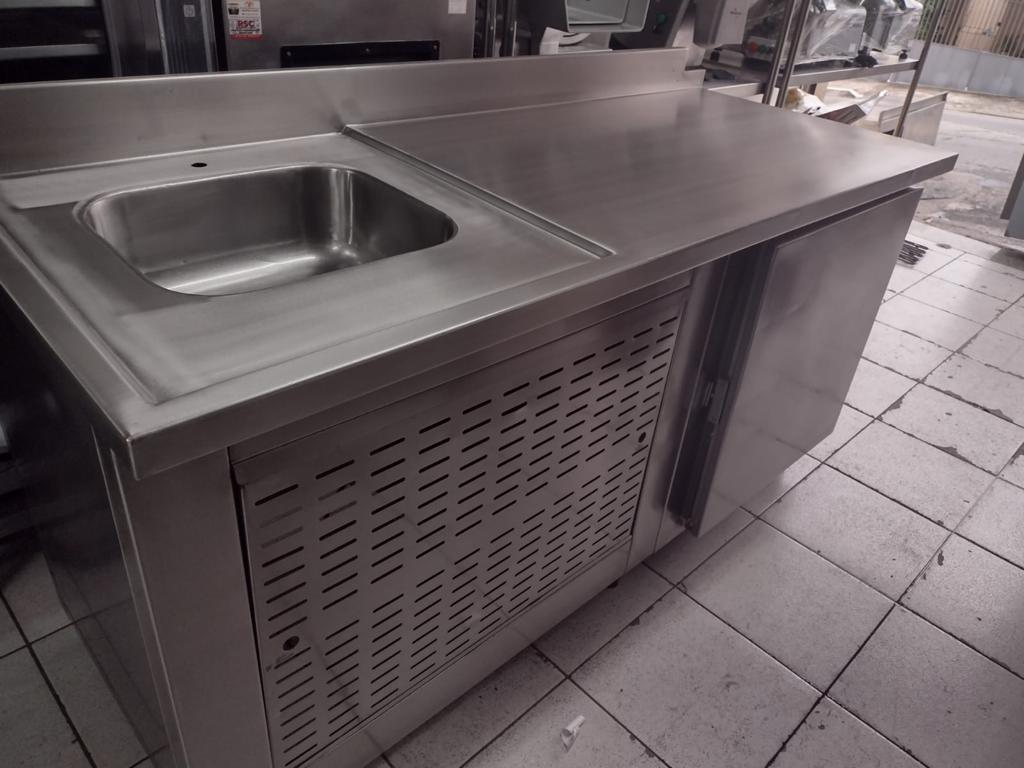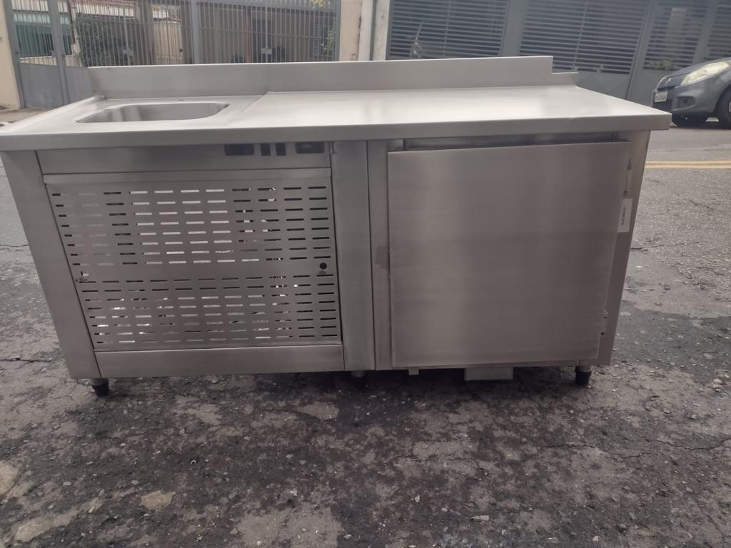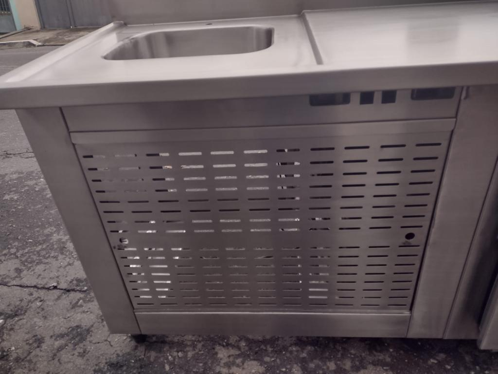 Balcão refrigerado fabricado em aço inox internamente e externamente. Possui cuba posicionada no lado esquerdo. Medidas: 175 x 70 x 90 cm.