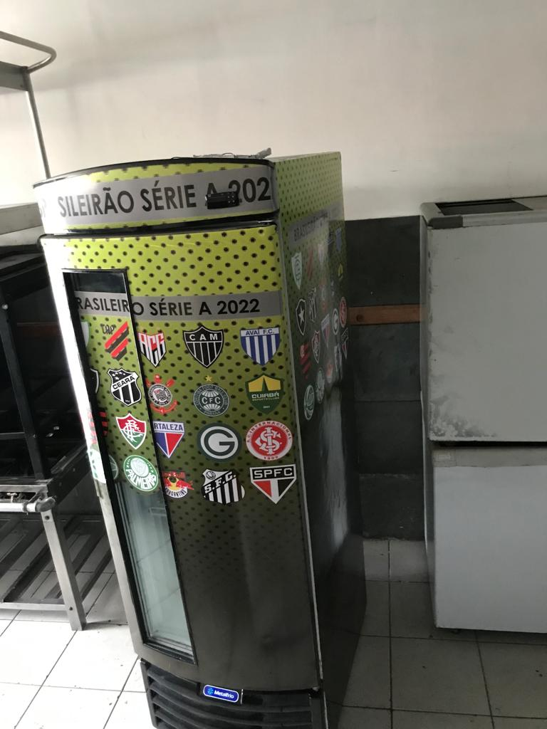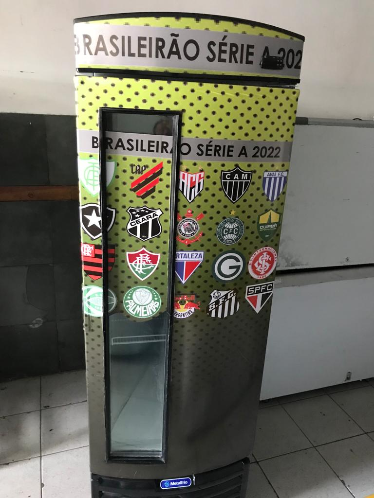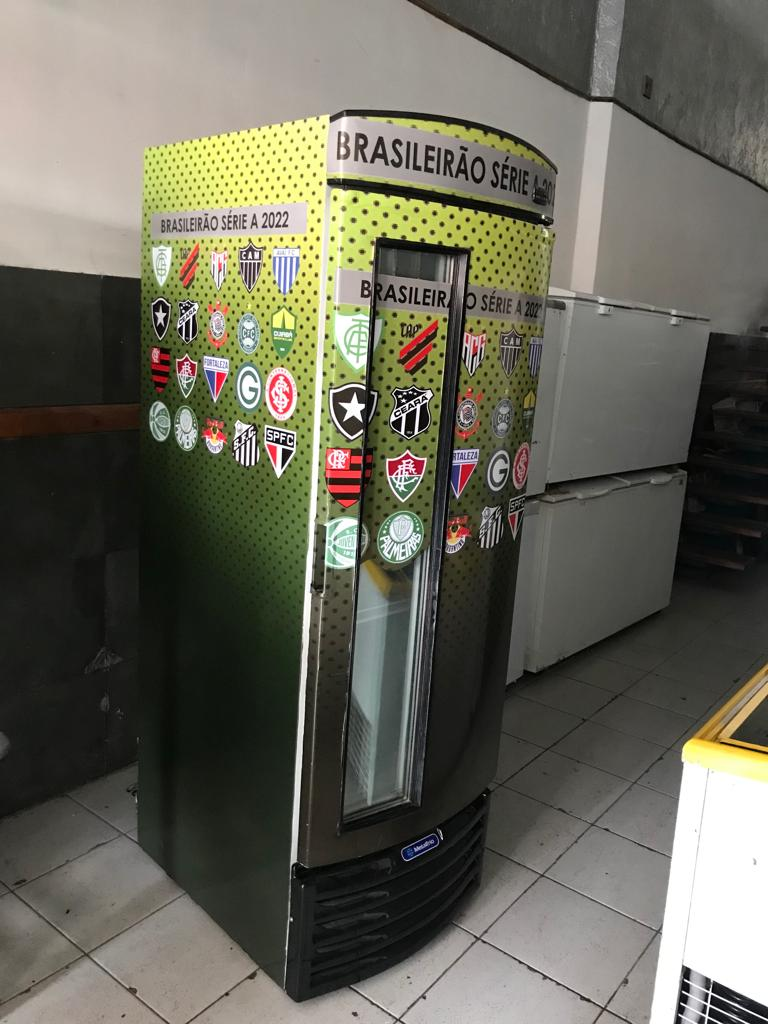 Cervejeira vertical com porta com visor e adesivada. Tensão: 220 V. Marca: Metalfrio.