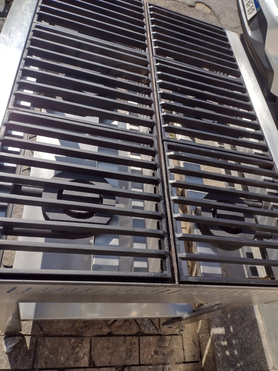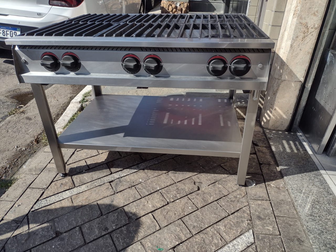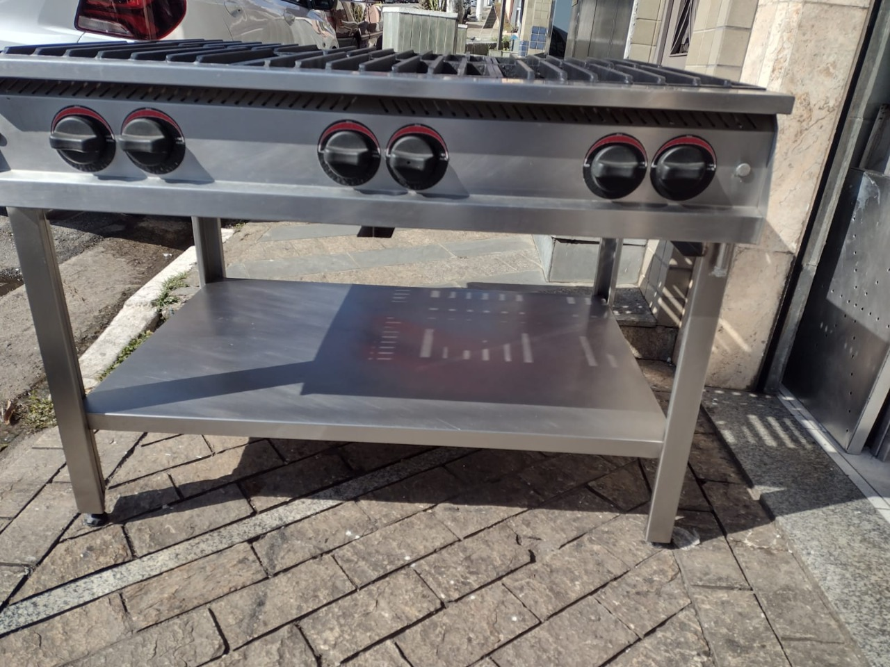 Fogão profissional fabricado em aço inox com seis bocas 40 x 40. Medidas: 120 x 96 x 89 cm.Descrição: