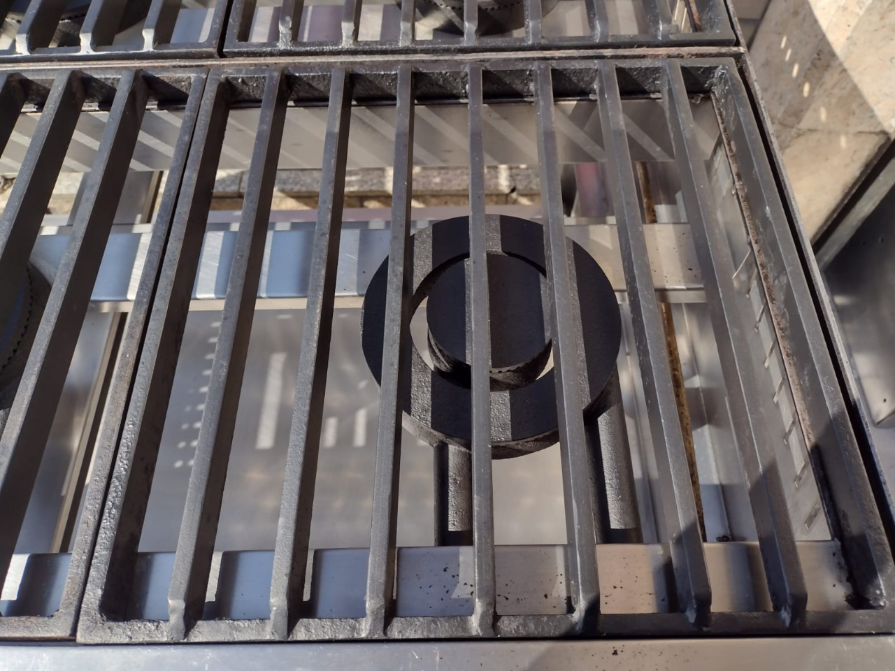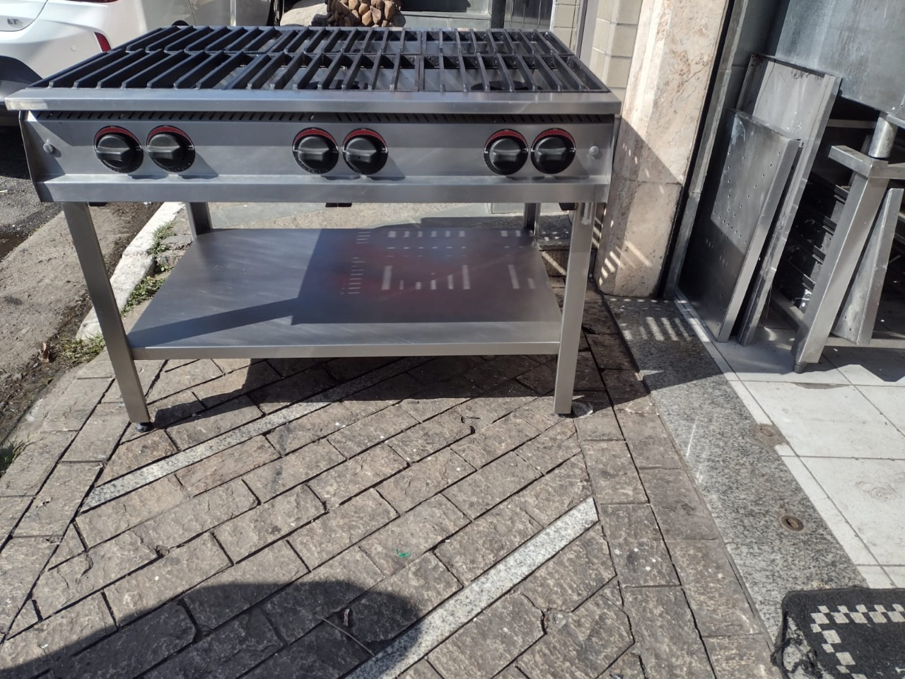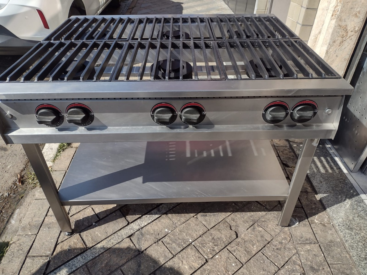 Fogão profissional fabricado em aço inox com seis bocas 40 x 40. Medidas: 120 x 96 x 89 cm.Descrição: