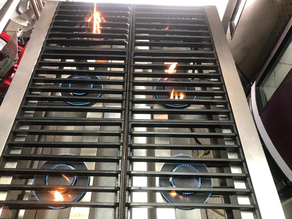 Fogão profissional fabricado em aço inox com seis bocas 40 x 40. Medidas: 120 x 96 x 89 cm.
