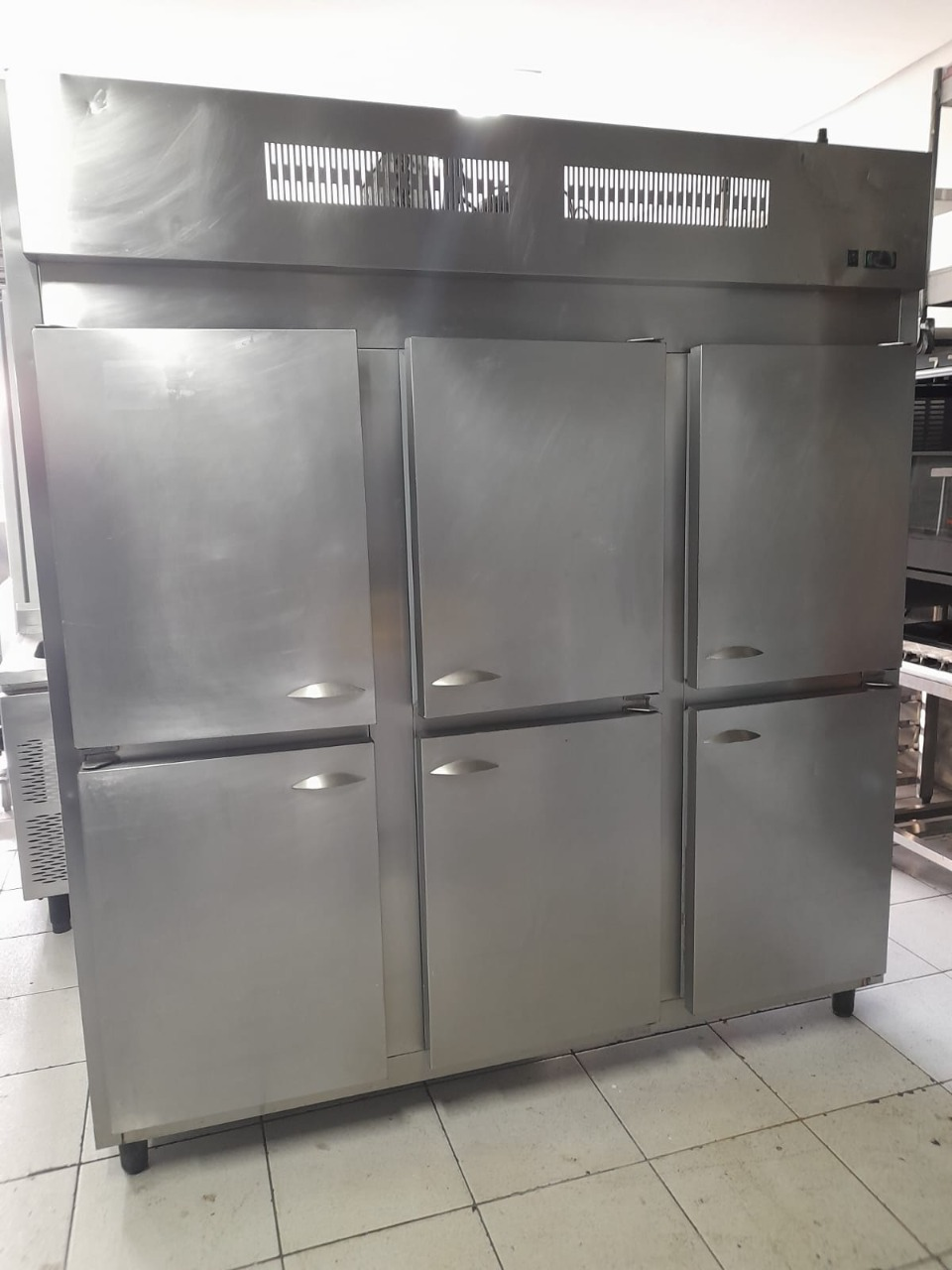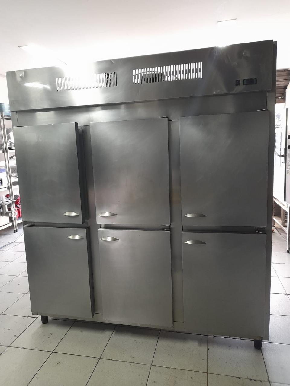 Geladeira comercial de inox com 6 portas. Tensão: 220 V. Medidas: 1,80 largura x 1,98 altura x 0,74 profundidade.